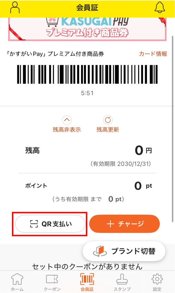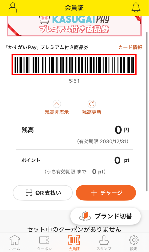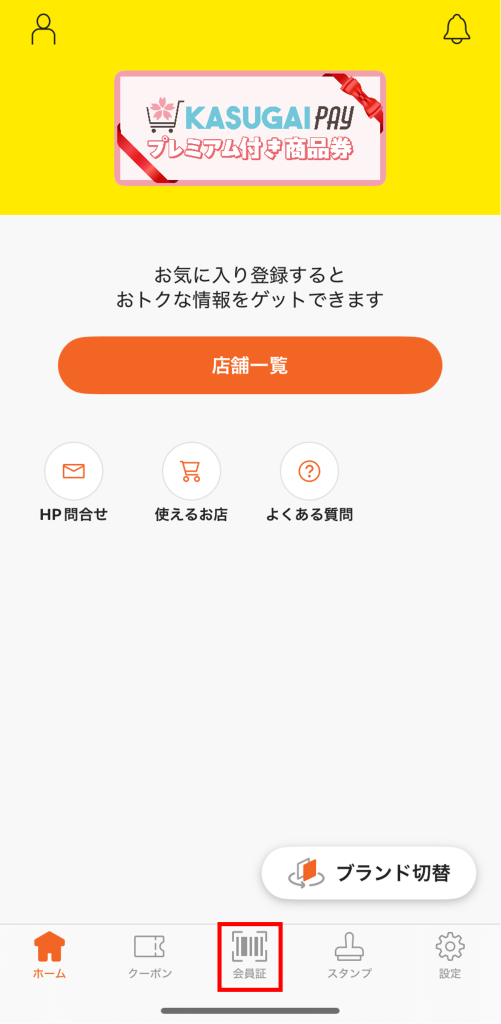 ①PocketPortalアプリを開き、かすがいPayプレミアム付き商品券のブランドを選択後、会員証をタップしてください。