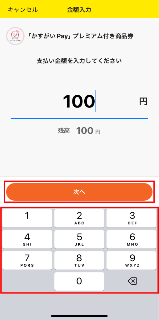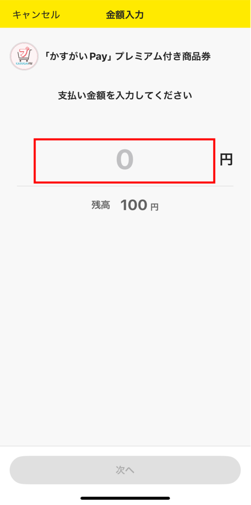 ④金額の入力を求められますので、金額をタップして支払い金額を入力して、「次へ」をタップしてください。