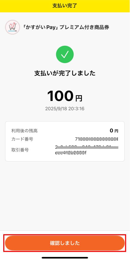 ⑥「支払いが完了しました」の画面をレジ担当の方にもご確認いただき、「確認しました」をタップしてください。